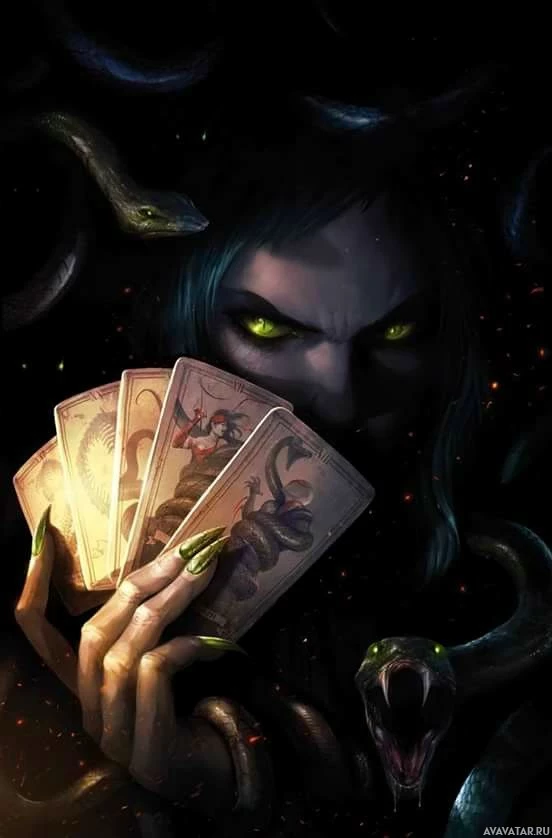 На картинке изображен персонаж, который, кажется, вдохновлен мифологической фигурой Медузой, Горгоной, известной своими змееподобными волосами. Этот персонаж изображен с игральными картами и смотрит на них с интенсивным выражением, возможно, предполагая связь между картами и судьбой. Фон имеет темную и таинственную атмосферу, соответствующую жанру фэнтези.