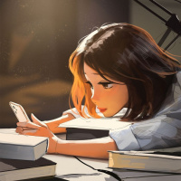 The image shows an animated girl who appears to be in a library or study setting. She is seated at a desk with various books around her and a lamp illuminating her work area. The girl seems to be focused on something, possibly using her phone or looking at a piece of paper. The overall atmosphere suggests she might be studying or doing research.