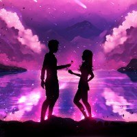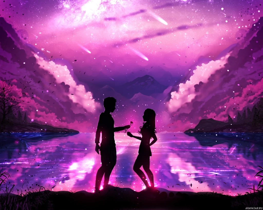 The image features a silhouette of two individuals, likely a couple or friends, standing close to each other with one person's arm wrapped around the other. They are looking into the distance, possibly towards a celestial view such as a starry