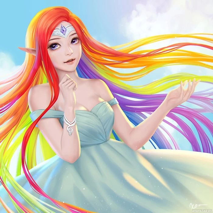 vibrant hair in various colors of the rainbow, which adds to her whimsical appearance. She has