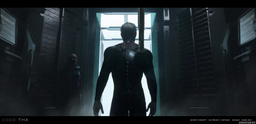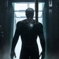 advanced technology or possibly a specialized role within this context. Behind the central figure, there are two other individuals, one seated at what seems to be