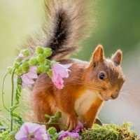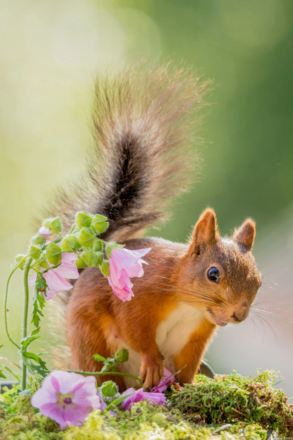 brown squirrel standing on what appears to be mossy ground. The squirrel has its head turned towards the camera, and it seems curious or alert about something in front of it. In the immediate foreground, there are pink flowers with thin green stems, adding
