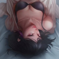 The image shows a female character lying on her back with her head resting on one hand. She has dark hair and is wearing lingerie. Her expression appears to be neutral or contemplative, and she's looking towards the camera.