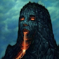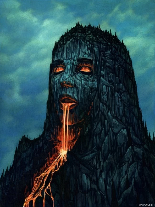 a fantastical scene with a humanoid figure at the center. This figure has a volcanic eruption occurring in its chest, with lava flowing out of