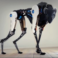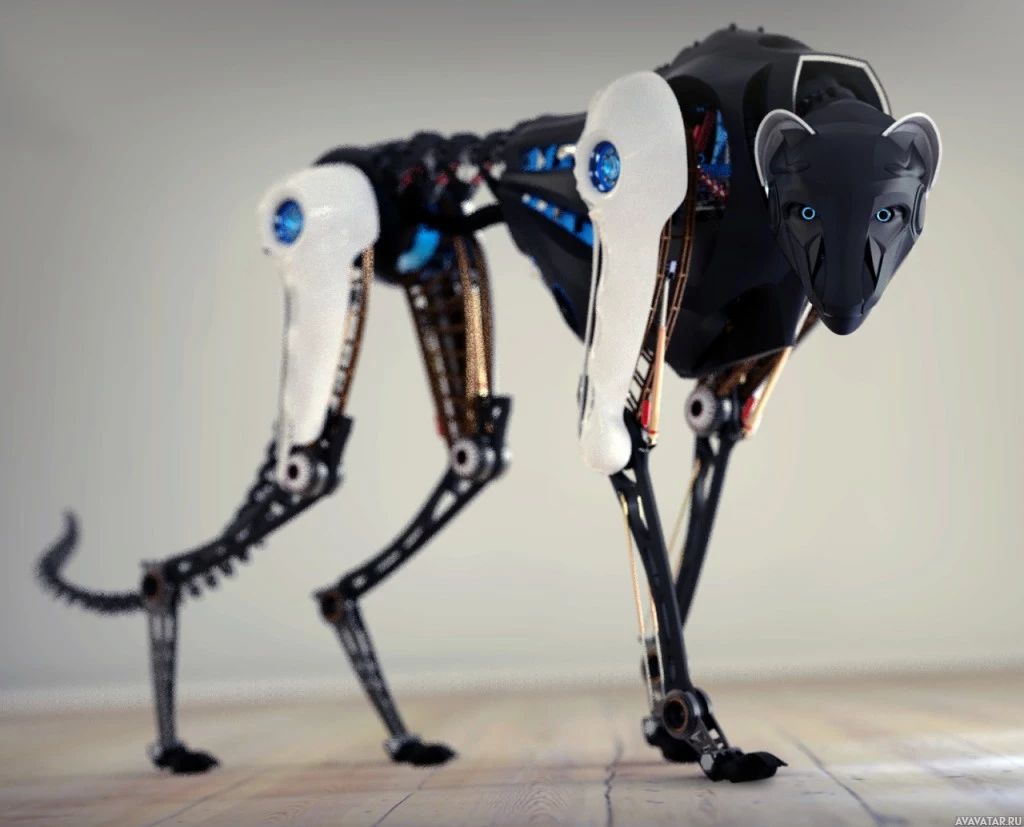 a robotic animal that resembles a wolf. It has a sleek body, with visible