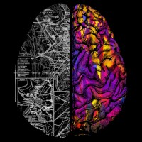 a human brain, with one half depicted in black and white illustrations, showing the layout of roads or pathways within the brain's cortex, suggesting the complexity of neural connections. The other half is vibrantly colored, highlighting