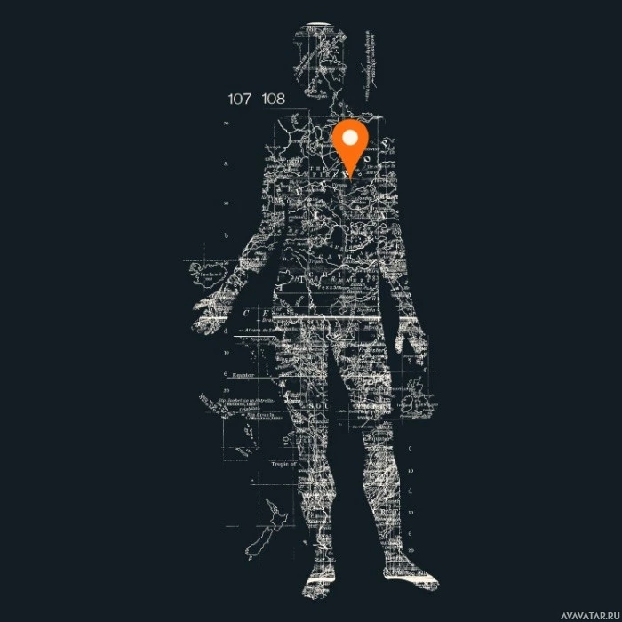 different shades and angles suggesting depth and form. The silhouette is superimposed on what appears to be a map or diagram, with lines and markers that could indicate