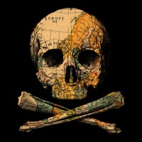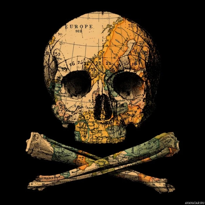 The image features a skull and crossbones, which is often associated with danger or piracy. On the skull's surface, there are images of various world maps, suggesting