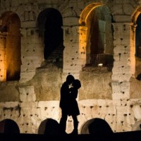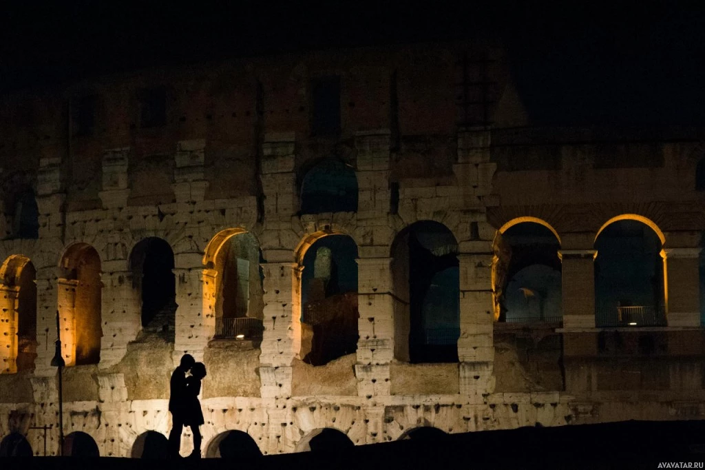 The image shows a silhouette of the Colosseum in Rome, Italy. It is taken at night, and the building appears as