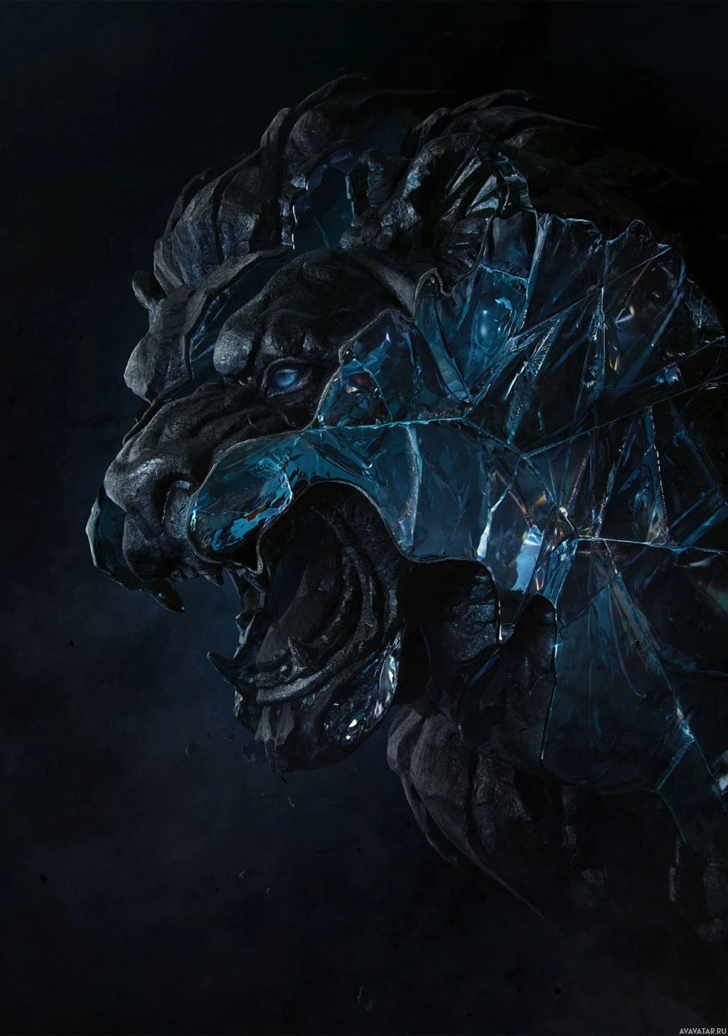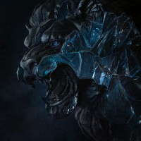 crystalline structures or ice forming around the lion's body, adding to its menacing appearance. The design is visually striking and seems to be a piece of