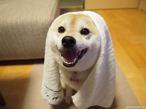 a small dog wearing a towel around its neck and over its head. It appears to be a Shiba Inu, a popular breed of Japanese dog known for its