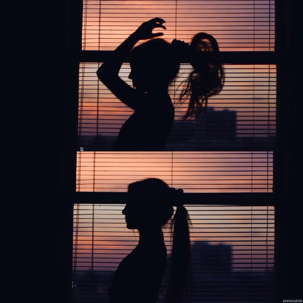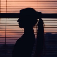 the silhouette of a girl with her hair up in a ponytail. She is looking out of a window that has vertical blinds, suggesting it's either dawn or dusk given