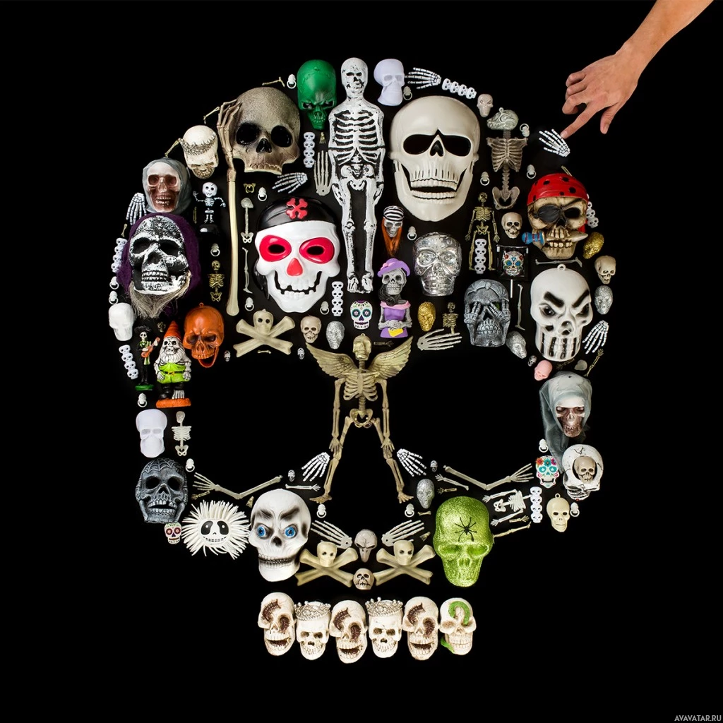 a circular pattern. Each skull is unique, with different designs or colors, suggesting they could be decorative items or props used for