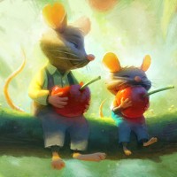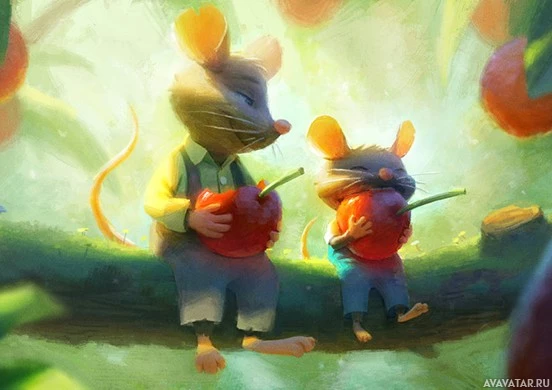 На картинке изображены две анимированные мыши, одна большая и одна меньшая. Они, кажется, сидят вместе в пышной, зеленой среде с деревьями, возможно, лесом или садом, учитывая присутствие вишни на деревьях вокруг них. Это причудливая и красочная сцена, которая может быть из анимационного фильма или сборника рассказов.