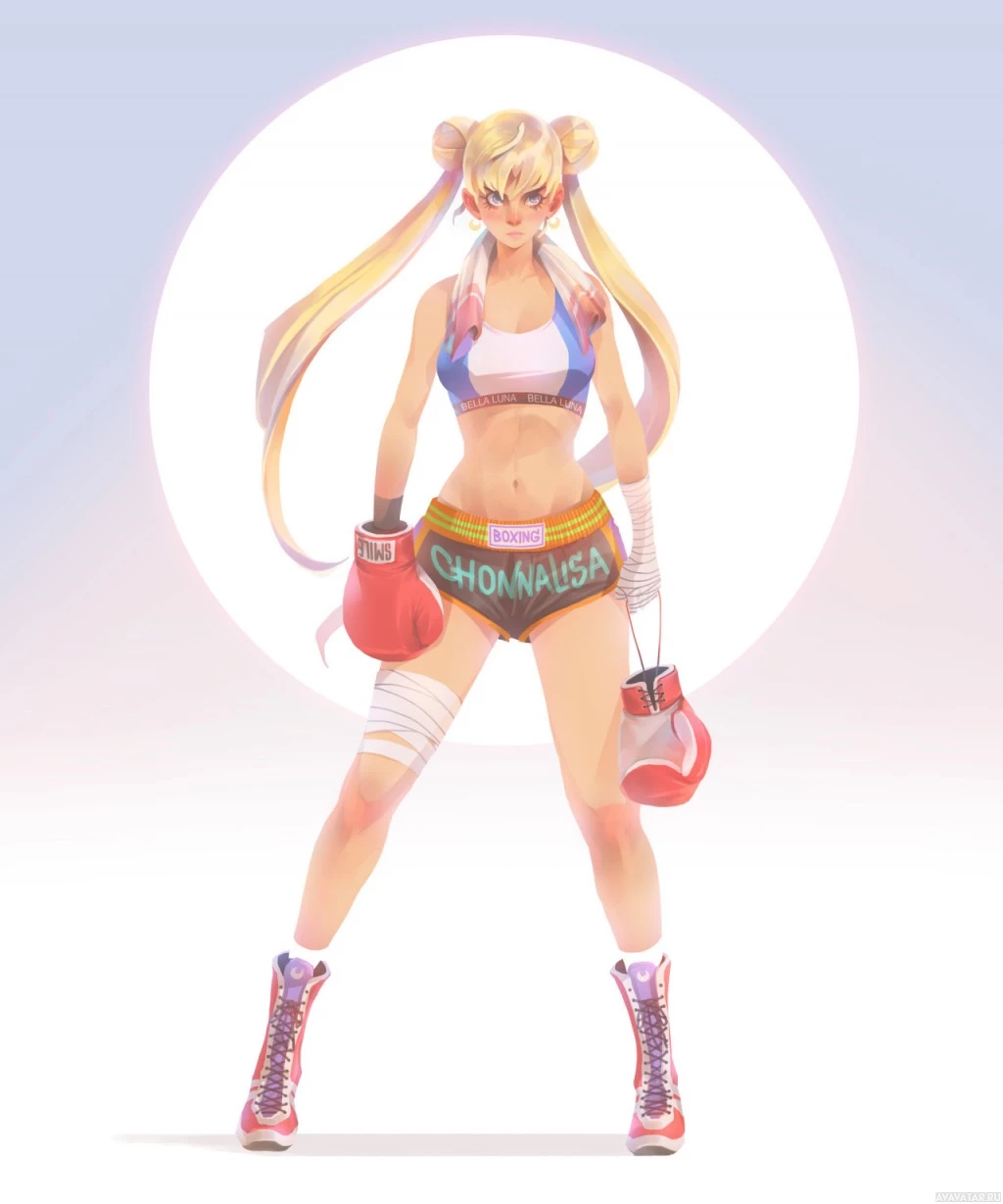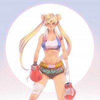 a dynamic pose, wearing a pair of red boxing gloves and matching boots, with her hands raised as if she has just thrown a punch or is ready for action. Her outfit consists of a blue and white sports top that reads "Choanusa," which suggests she could be
