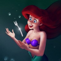 На картинке изображен анимированный персонаж, напоминающий Ариэля, русалку из популярного анимационного фильма. Ее показывают с вытекающими наружу волосами, и она, кажется, держит вилку в одной руке и светящуюся сферу в другой. Фон предполагает подводную обстановку с видимыми пузырьками.