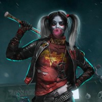 a leather jacket and holding a baseball bat. She has distinctive makeup and hairstyle typical for the character's