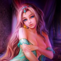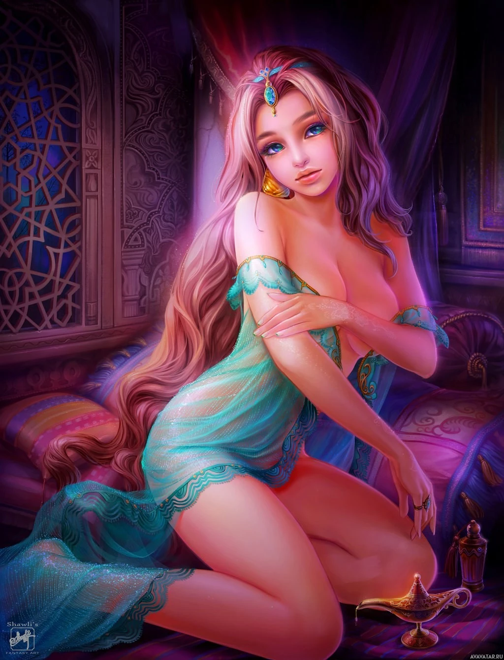 a sensual pose, lying down on what seems to be a luxurious setting with a richly decorated room around her. Her attire and the overall ambiance suggest a fantasy or romantic theme. The artwork showcases a high