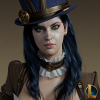 blue hair and wearing what appears to be a steampunk-inspired outfit, complete with goggles and a badge on her chest. She has