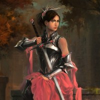 dark hair, wearing armor and holding a sword. She is standing in front of what appears to be an old
