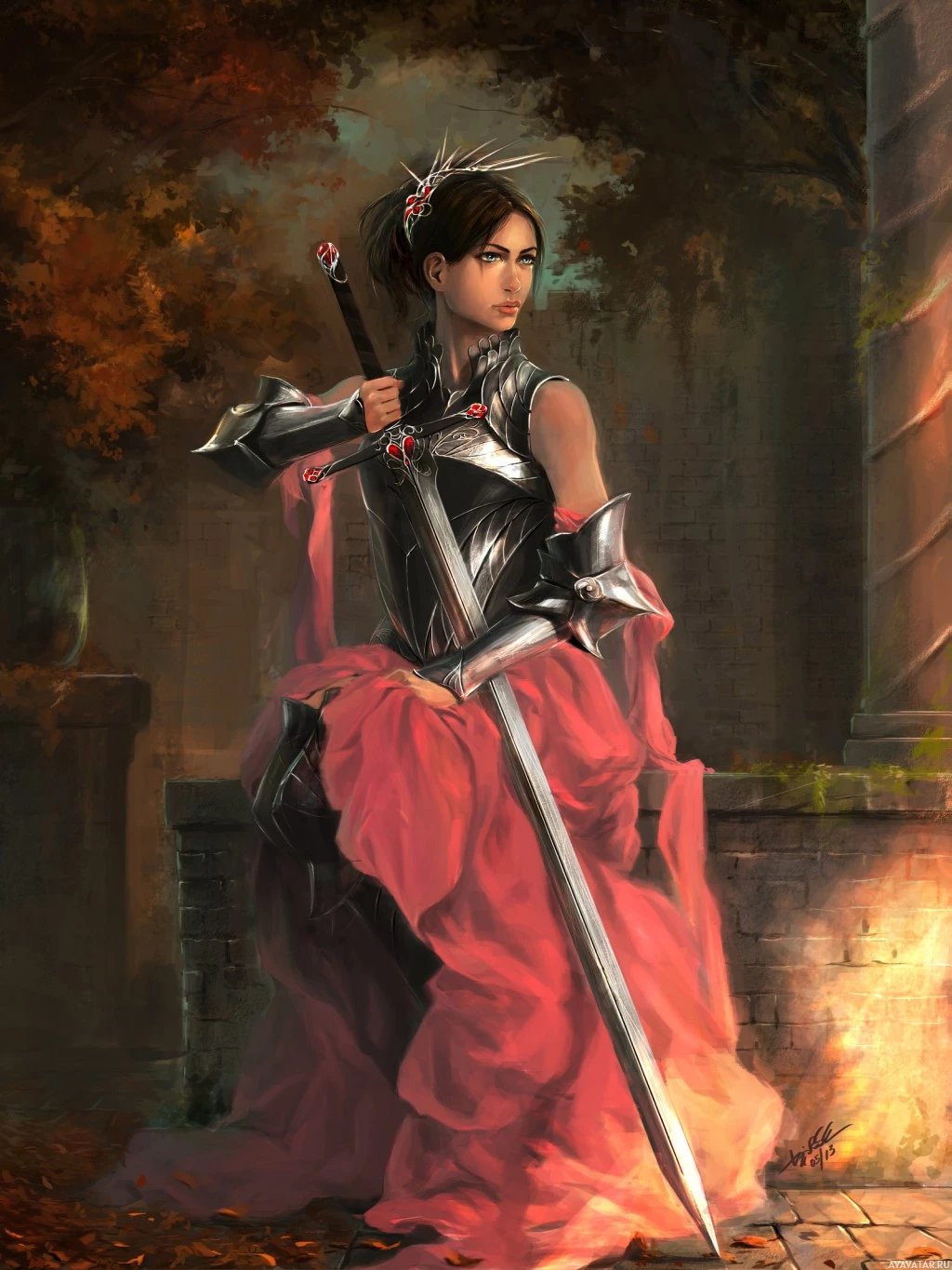 stone structure, possibly a castle or ruins, with autumn leaves scattered on the ground. Her attire suggests she may be a warrior or a character from a historical or fantasy setting. The art style is realistic with