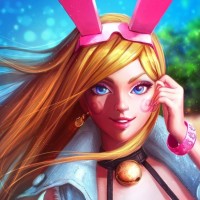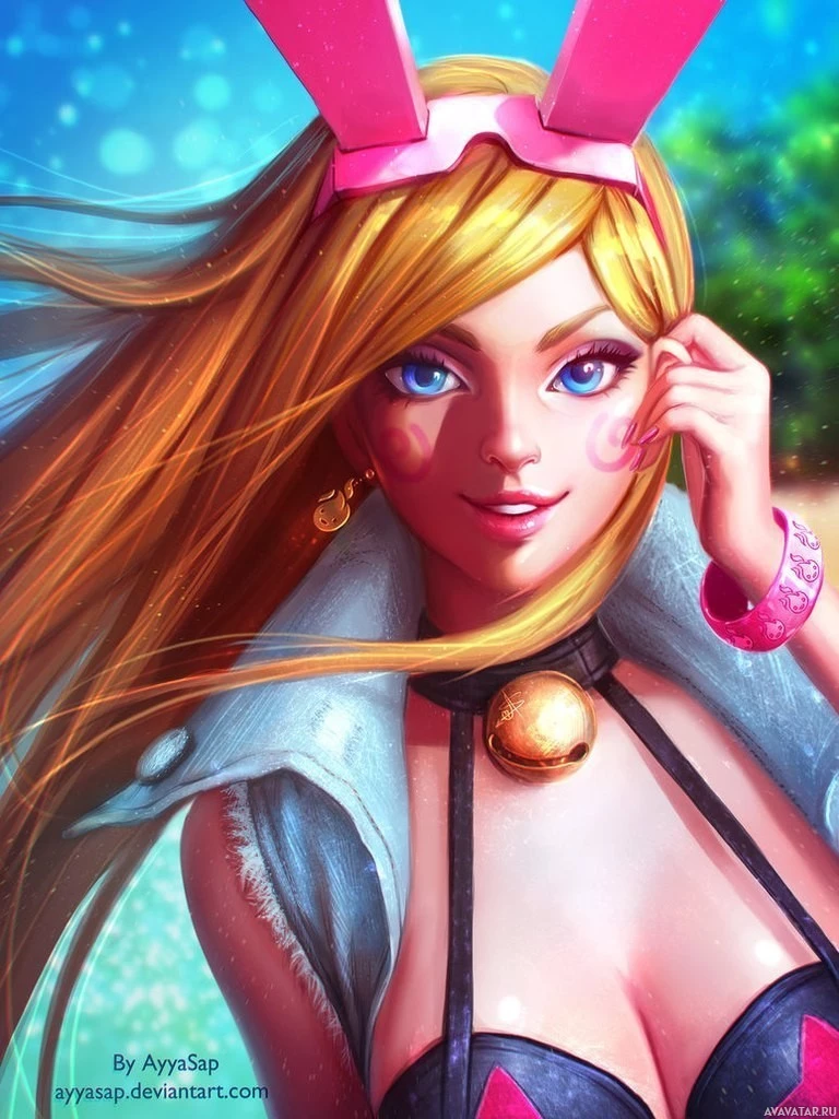 blonde hair and is wearing bunny ears as part of her outfit. Her attire consists of what appears to be