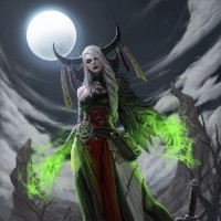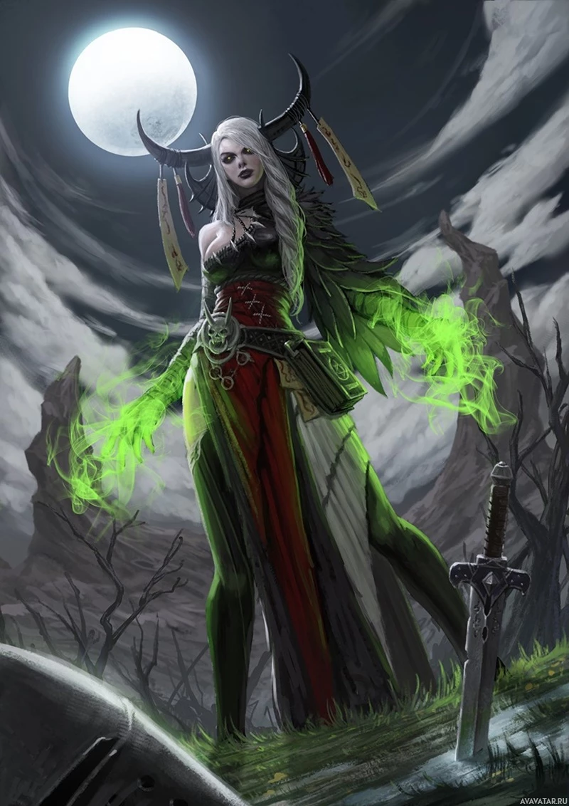 a fantasy character, likely a witch or sorceress, standing under the moonlit sky. She has long