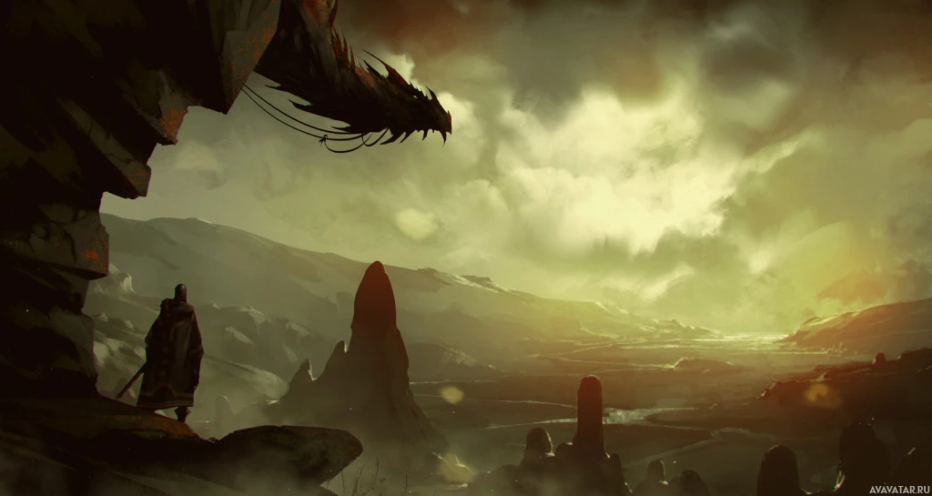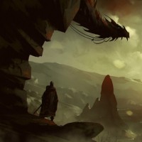 rocky outcrop or structure to the left of the dragon figure, adding a sense of ruggedness and isolation to the scene.