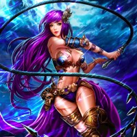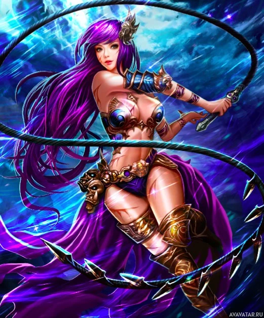 На картинке изображен иллюстрированный персонаж, который выглядит как женщина-воин или персонаж фэнтези. Она имеет фиолетовые волосы и изображена в динамическом действии, раскачивая посох или оружие. Персонаж украшен тем, что кажется доспехами и аксессуарами, обычно связанными с фэнтези или игровыми темами. Фон предполагает магическую или боевую обстановку с мистическими элементами.