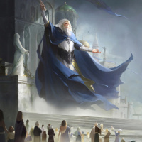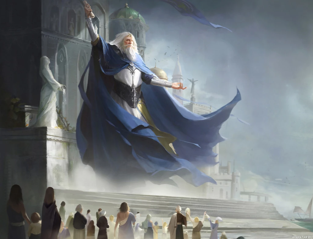 various people, possibly followers or citizens, who appear to be looking up at the wizard with reverence or curiosity. The atmosphere is ethereal and mystical, with