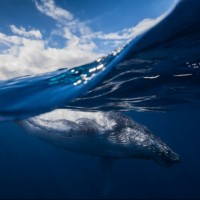 На снимке изображен горбатый кит в океане. Это млекопитающее, известное своими большими размерами тела, длинными ластами и уникальным горбом на спине. Горбатые киты также известны своим сложным социальным поведением и впечатляющими миграциями между местами кормления и размножения.
