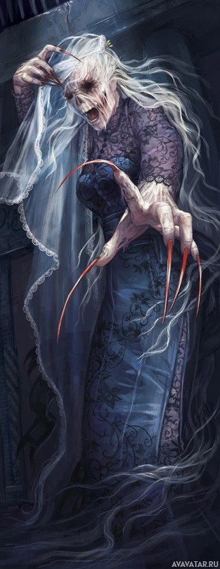The image depicts a horror-themed scene. There is an elderly woman with long, flowing
