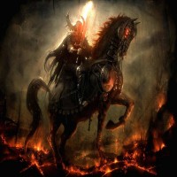 an armored knight or warrior, given the sword and shield they are holding. The horse is shown in motion, possibly charging or galloping. The background suggests an apocalyptic or hellish setting with flames and lava, indicating a scene of