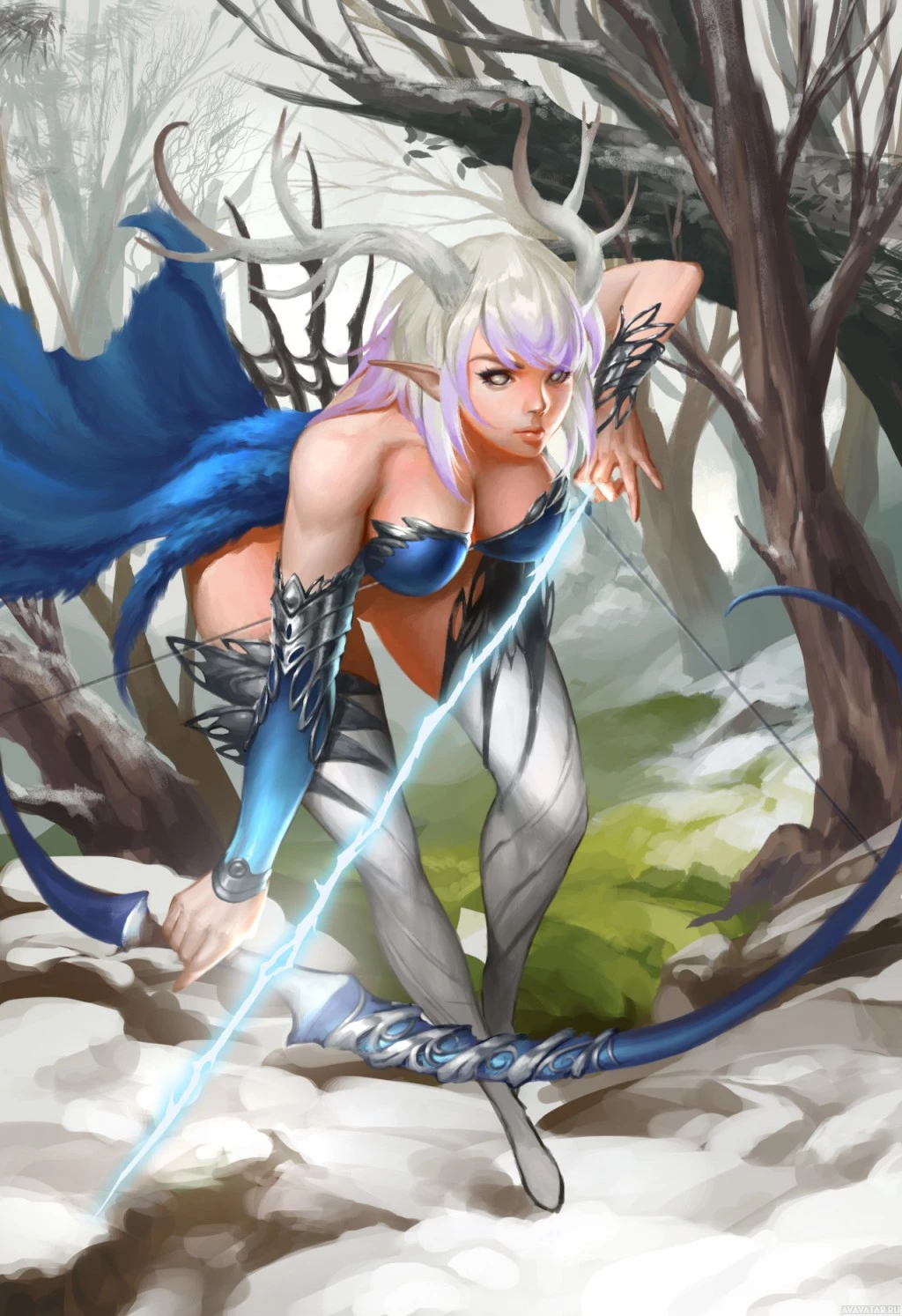 white hair and is dressed in what appears to be elven or fairy-like attire, with elements of blue and green colors. She is holding two bows, suggesting she might be an archer or involved in some kind of combat or hunting role. The environment around her looks like a misty forest, adding to
