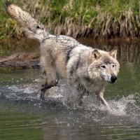 The picture shows a wolf. The wolf is in motion, running through shallow water. It appears to be a healthy adult wolf with its fur wet from the water it's passing through.