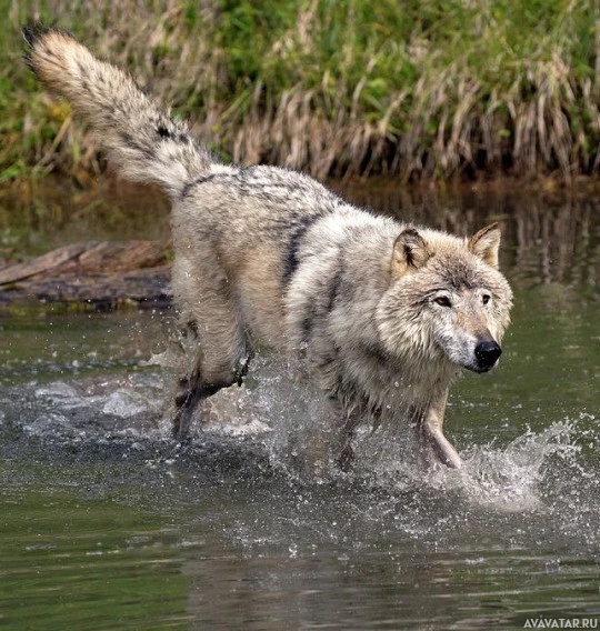 На картине изображен волк. Волк находится в движении, пробегая по мелководью. Похоже, что это здоровый взрослый волк с мокрым мехом из воды, через которую он проходит.