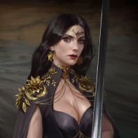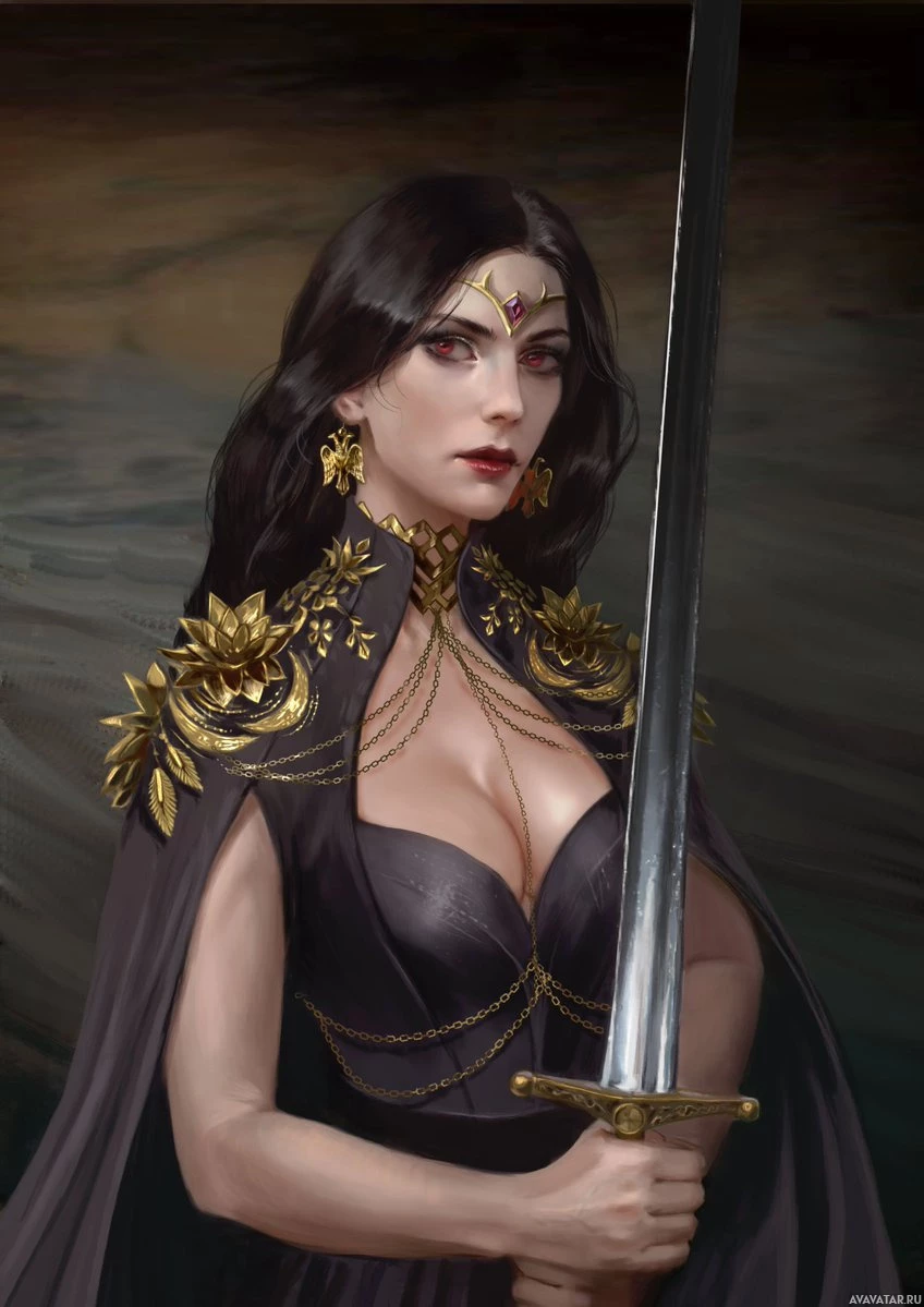 На картинке изображена женщина, которая выглядит как воин или архетип опекуна. У нее темные волосы, и она носит подробный костюм, который включает в себя доспехи, украшения и меч, который держится в одной руке. Ее одежда предполагает, что у нее может быть фантазия или исторический контекст, а ее поза указывает на готовность к битве или защите.