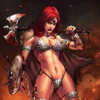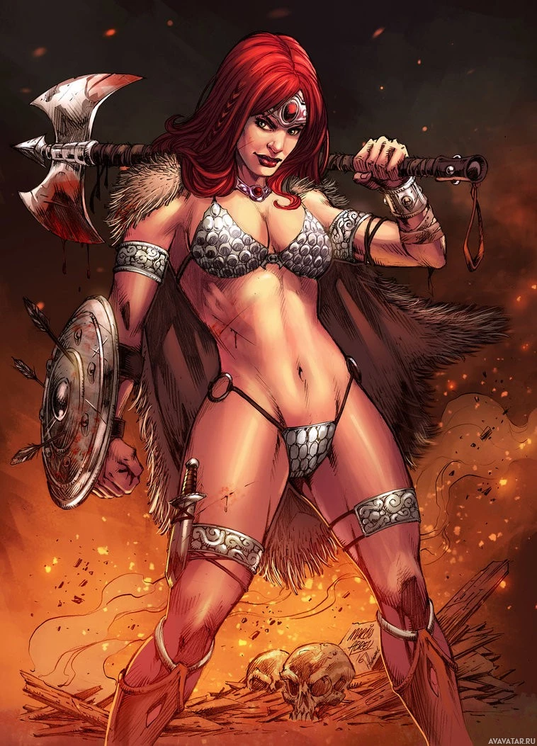 a female character with red hair, dressed in what appears to be warrior-like attire. She is wielding an axe and has