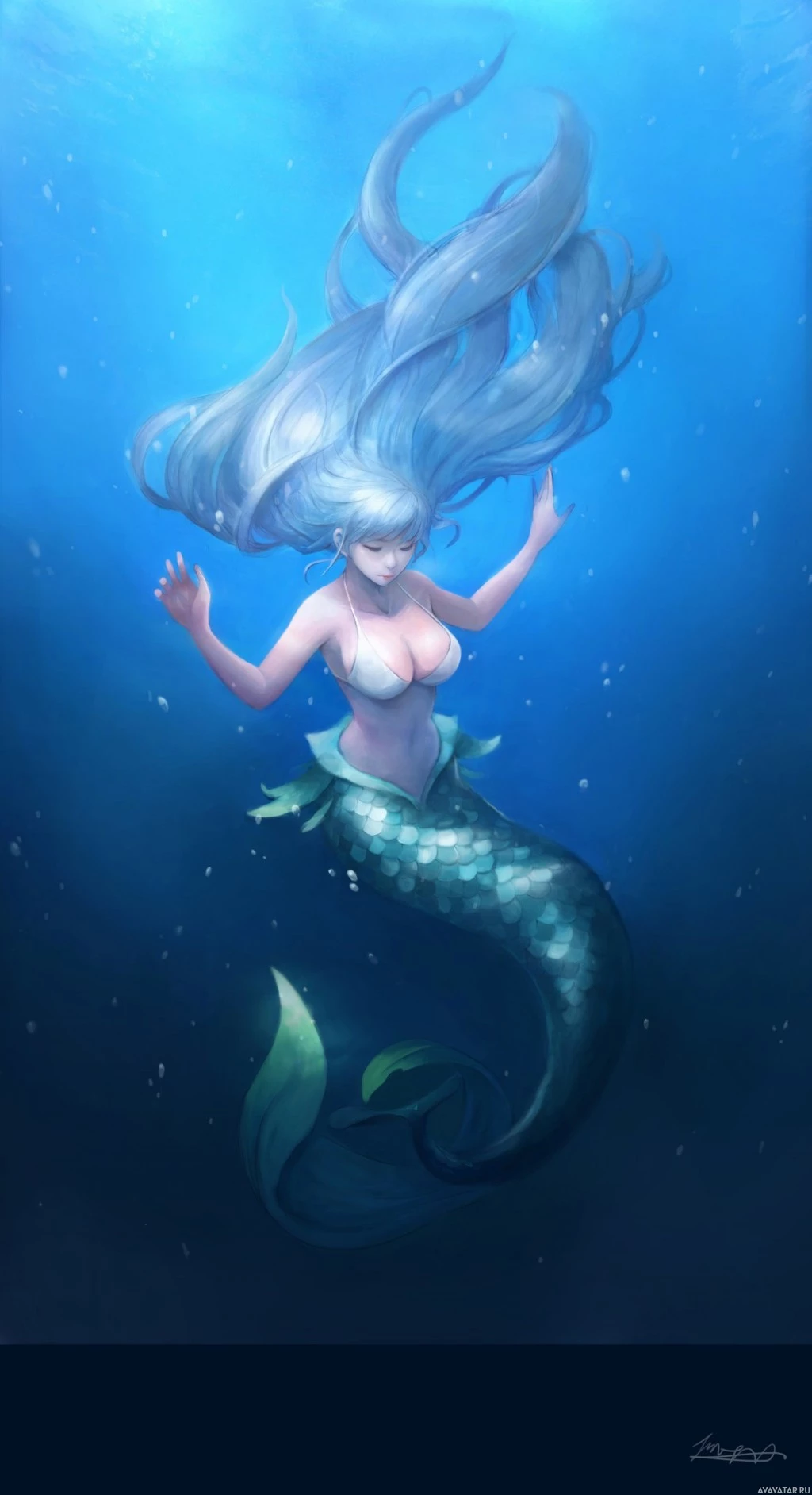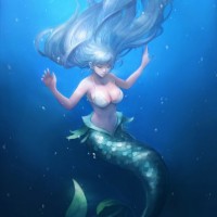 mermaid imagery in folklore. Her tail, also like that of a fish, extends from behind her legs. It's a piece of artwork likely intended for fans of fantasy and