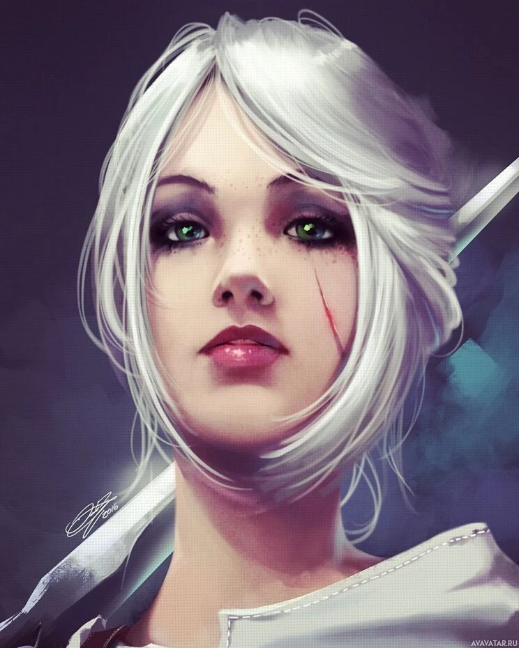 a female character with a serious expression. She has short, silver hair and is adorned with what appears to be armor or clothing that suggests she could be from a fantasy or video