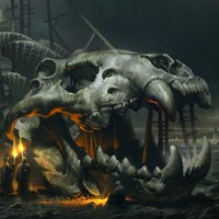 broken walls and ramparts, suggesting some form of war or destruction; there are multiple smaller skulls scattered around, reinforcing the theme of death and decay. In the background, there is
