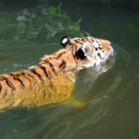 The image shows a tiger swimming in water. It appears to be a natural habitat for the tiger, possibly a river or lake. The tiger's head and part of its body are above the water surface while it moves through the water.