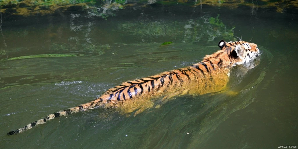 На картинке изображен тигр, плавающий в воде. Это естественная среда обитания тигра, возможно, река или озеро. Голова тигра и часть его тела находятся над поверхностью воды, когда он движется через воду.