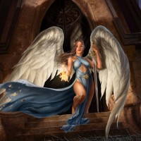 The image depicts a fantasy-themed character that appears to be an angel. She is standing in front of an ornate door or entrance, suggesting she may be entering or exiting the place. The artwork has a vibrant and detailed style, with attention given to the intricate details of her wings and the surrounding environment.