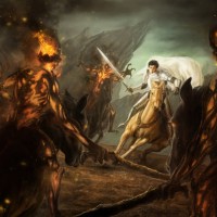 a knight on horseback wielding a sword and facing a group of zombie-like creatures. These creatures are distorted in appearance with