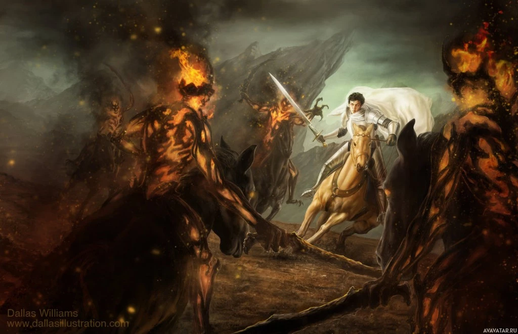 red eyes and appear to be attacking or threatening the knight. The background features a dark,