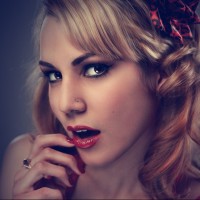 На снимке изображена женщина со светлыми волосами, стилизованными волнами. У нее темная помада, и она смотрит прямо в камеру с слегка открытым ртом, как будто она в середине речи или выражает удивление. Фотография выглядит стилизованной, возможно, для рекламы или конкретной художественной цели.