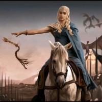 Daenerys Targaryen. She is riding on horseback, wearing