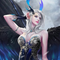 The image features a fantasy-style character, likely inspired by angelic or demonic themes. She has