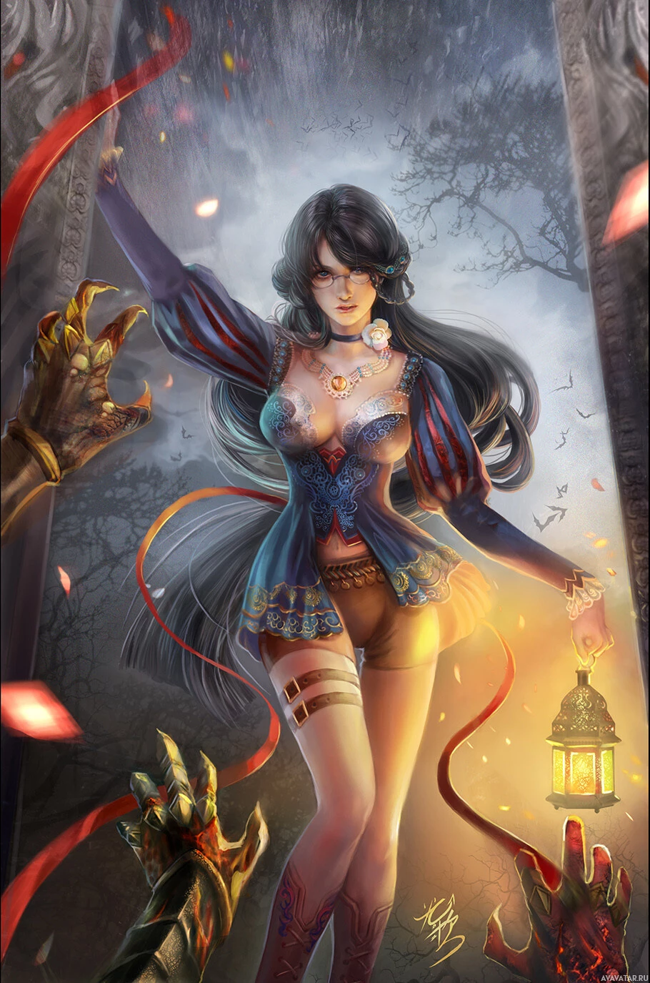 forest setting, with the light from the lantern casting an ethereal glow around her. The character's pose is elegant and confident, suggesting she might be a magical or mythological figure.